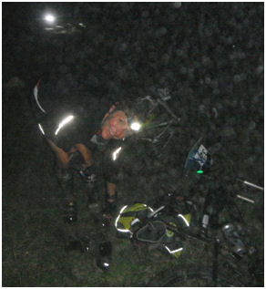 Avec la tombée de la nuit, Annick décroche et comme nous sommes tout un groupe, cette portion VTT deviendra collective…à mon grand soulagement car sans lunettes, impossible pour moi de suivre une carte en pédalant de nuit, surtout que la fatigue commence réellement à se faire sentir ! Heureusement, cette portion est roulante, voire très descendante, je suis même épatée de ne pas avoir pris une seule chute dans les descentes tout au long de cette journée, je ne me savais pas capable de descendre ces chemins plein de pierres et de racines à cette vitesse, mais avec Juju devant…pas le choix !!!