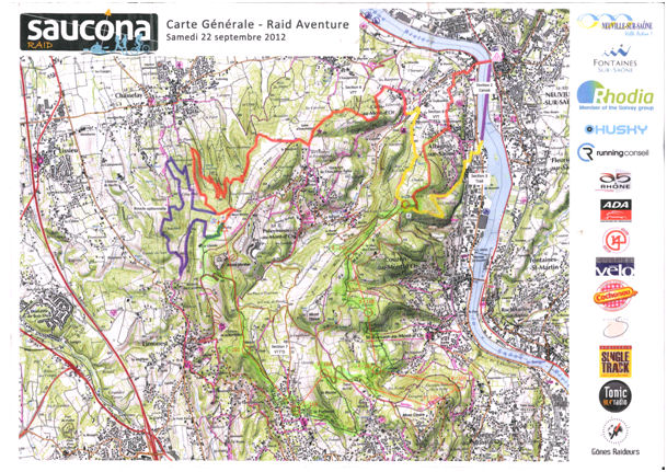 9h, samedi 23/09, je retrouve mon coéquipier Bananacube, Juju le Sanglier à la gare de Lyon et nous prenons la route de Neuville sur Saone, lieu du Saucona Raid Aventure…sous la pluie !!!