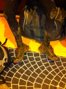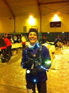 Enfin, l arrivée dans le gymnase après 4h de course ( ça donne une idée du terrain!), j ai les jambes raides mais comme à la fin de chaque course, soulagée et heureuse. Alain arrive environ 20/30 min après moi, c est son 2ème trail; ses mots: « purée, c était dur! »