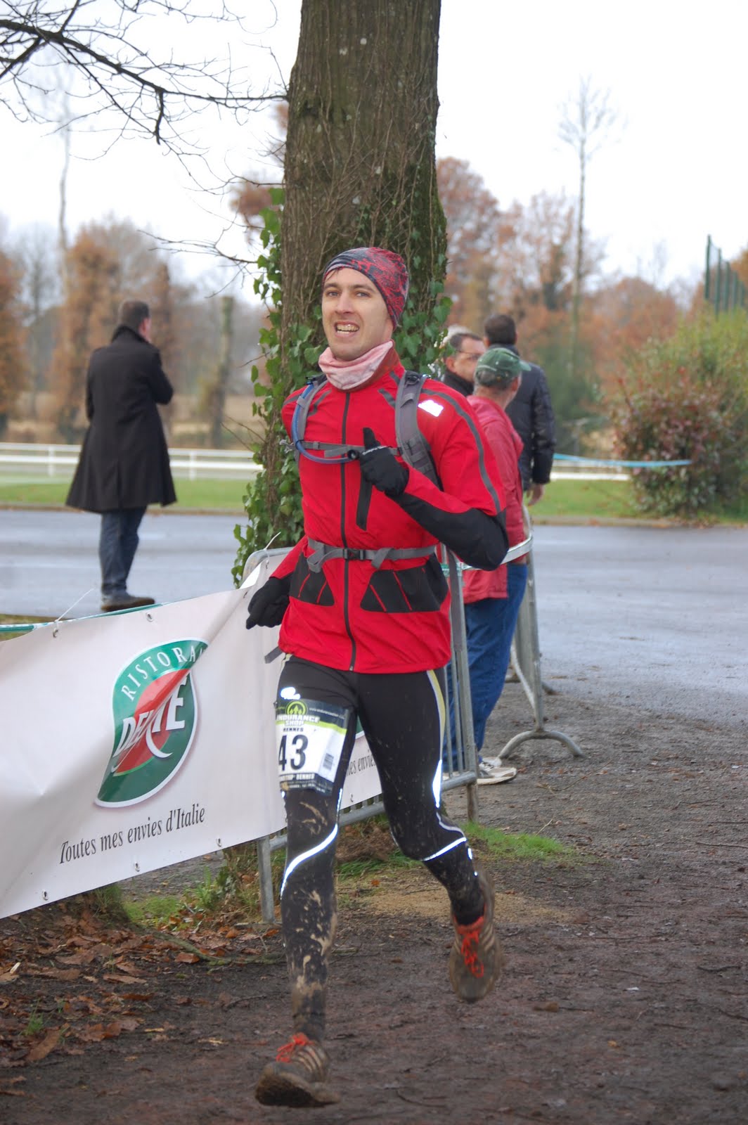75% de chemins sur un terrain globalement plat (160m D+). Après 2km de course, on a le choix entre sauter une rivière au risque de se vautrer lamentablement dans la boue ou bien de traverser la rivière les pieds dans la flotte comme si de rien n'était. J'ai choisi l'option 2 avec l'avantage d'avoir les 2 pieds mouillés et de ne plus se poser de question par la suite lorsqu'il fallait décider ou pas de passer dans une mare de boue 😉