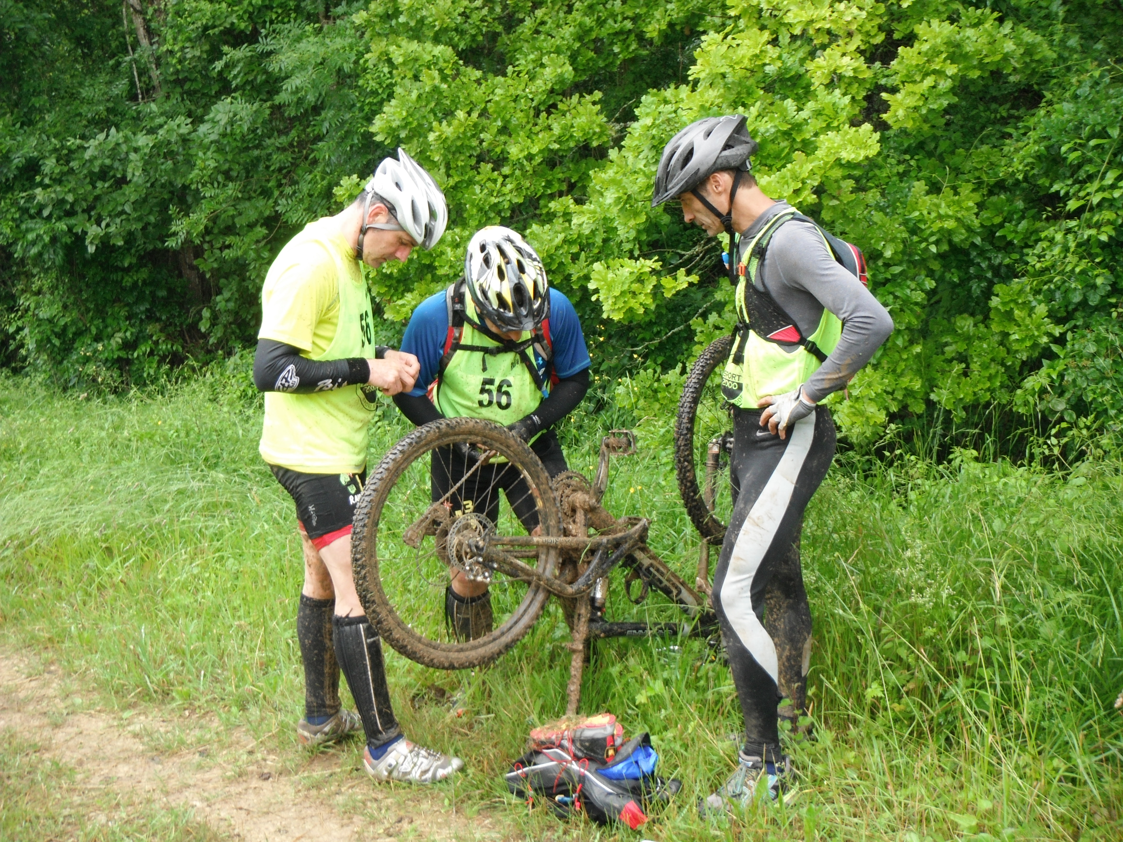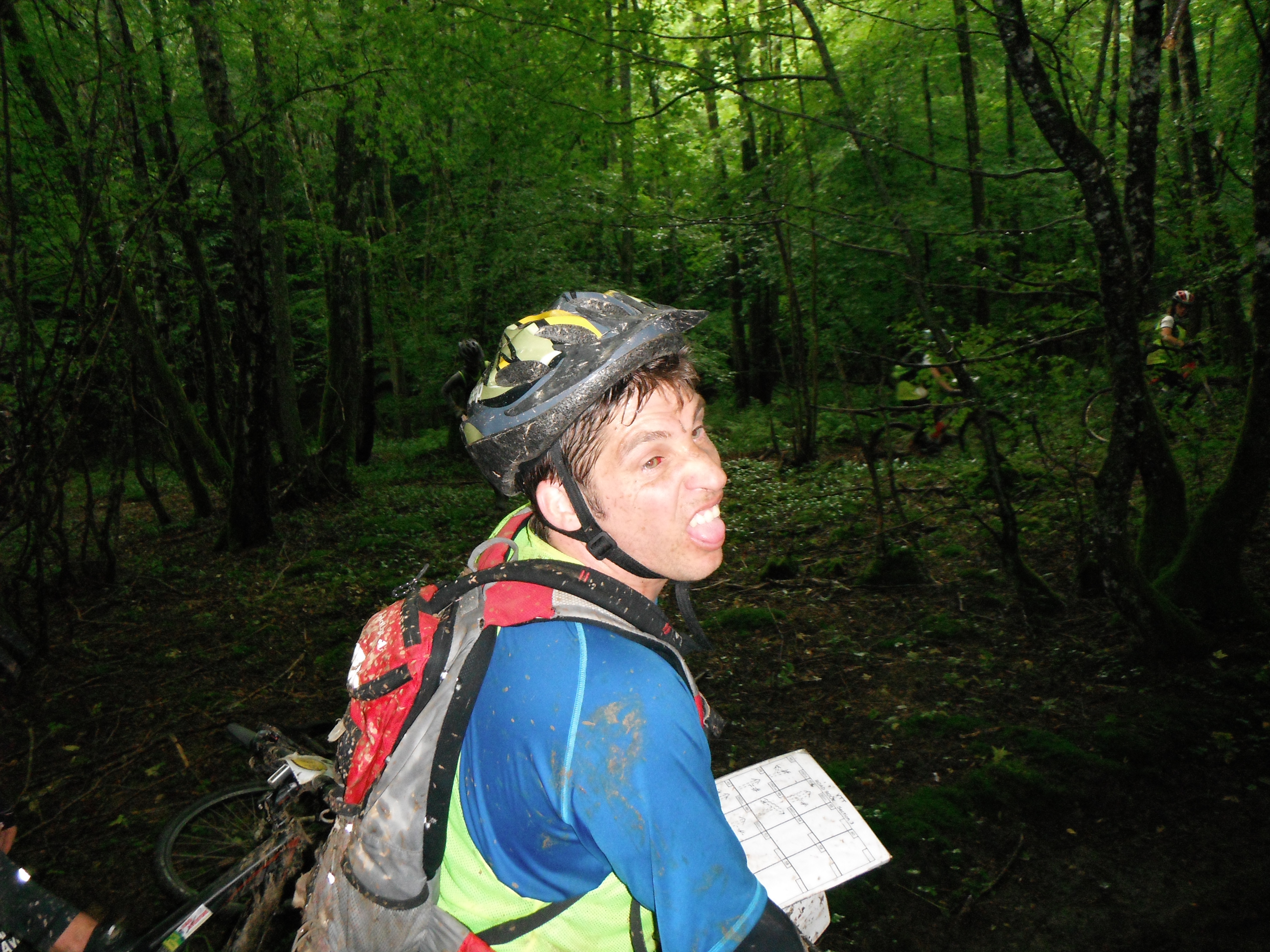 A: Tout se passe bien, malgré la difficulté des chemins techniques en raison de la boue …jusqu'à ma 1ère belle chute qui me sèche sur place pendant quelques minutes, mais ce ne sera malheureusement pas la dernière, je vais même en reprendre une belle un peu plus tard et là, c'est le pouce qui trinquera…puis Juju qui casse sa chaîne!!!
