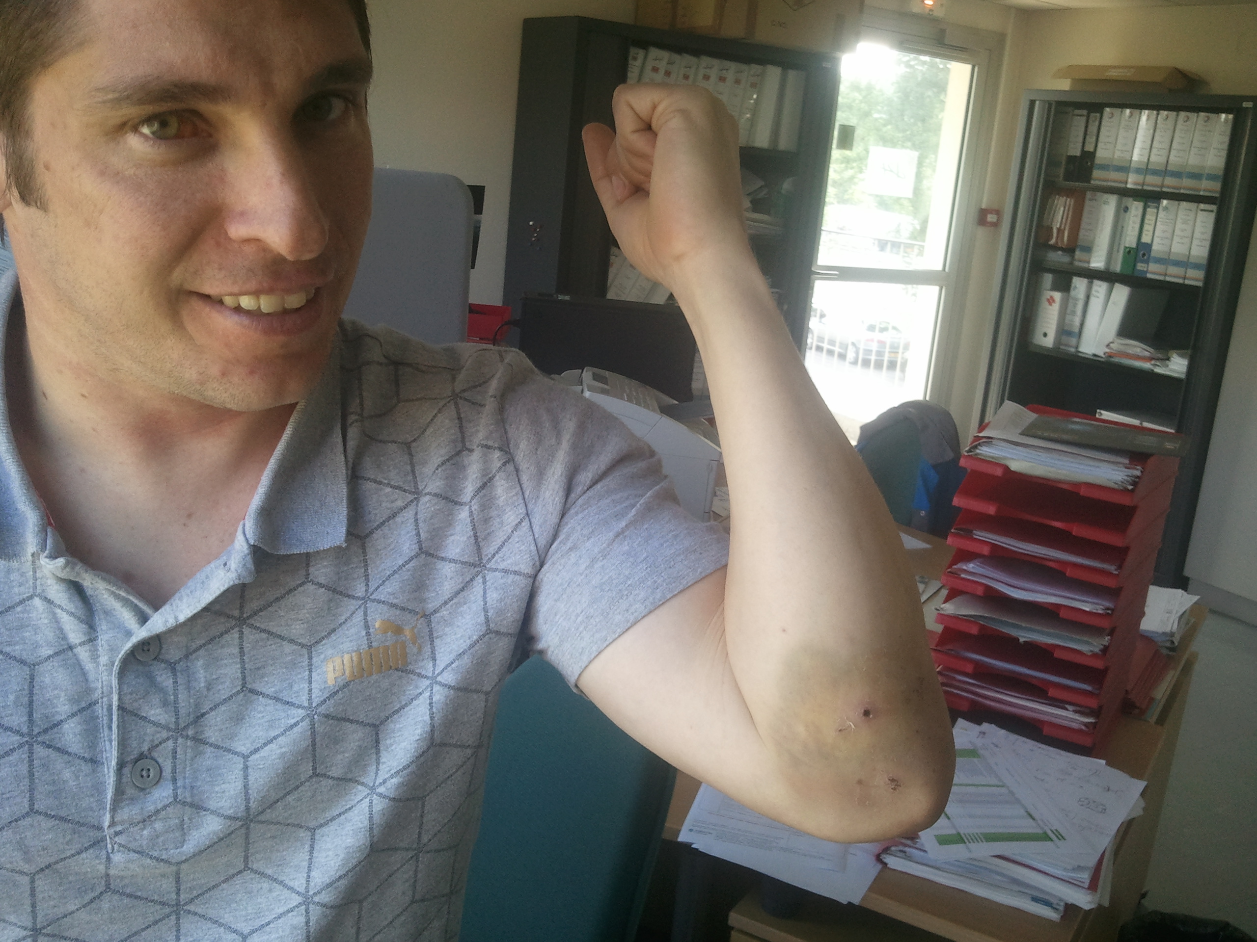 C'est Juju qui va en faire les frais le 1er avec une grosse chute en descente qui lui vaudra un bon bleu sur le coude…