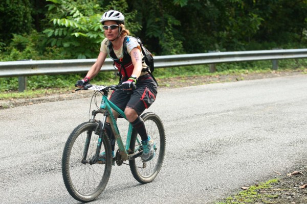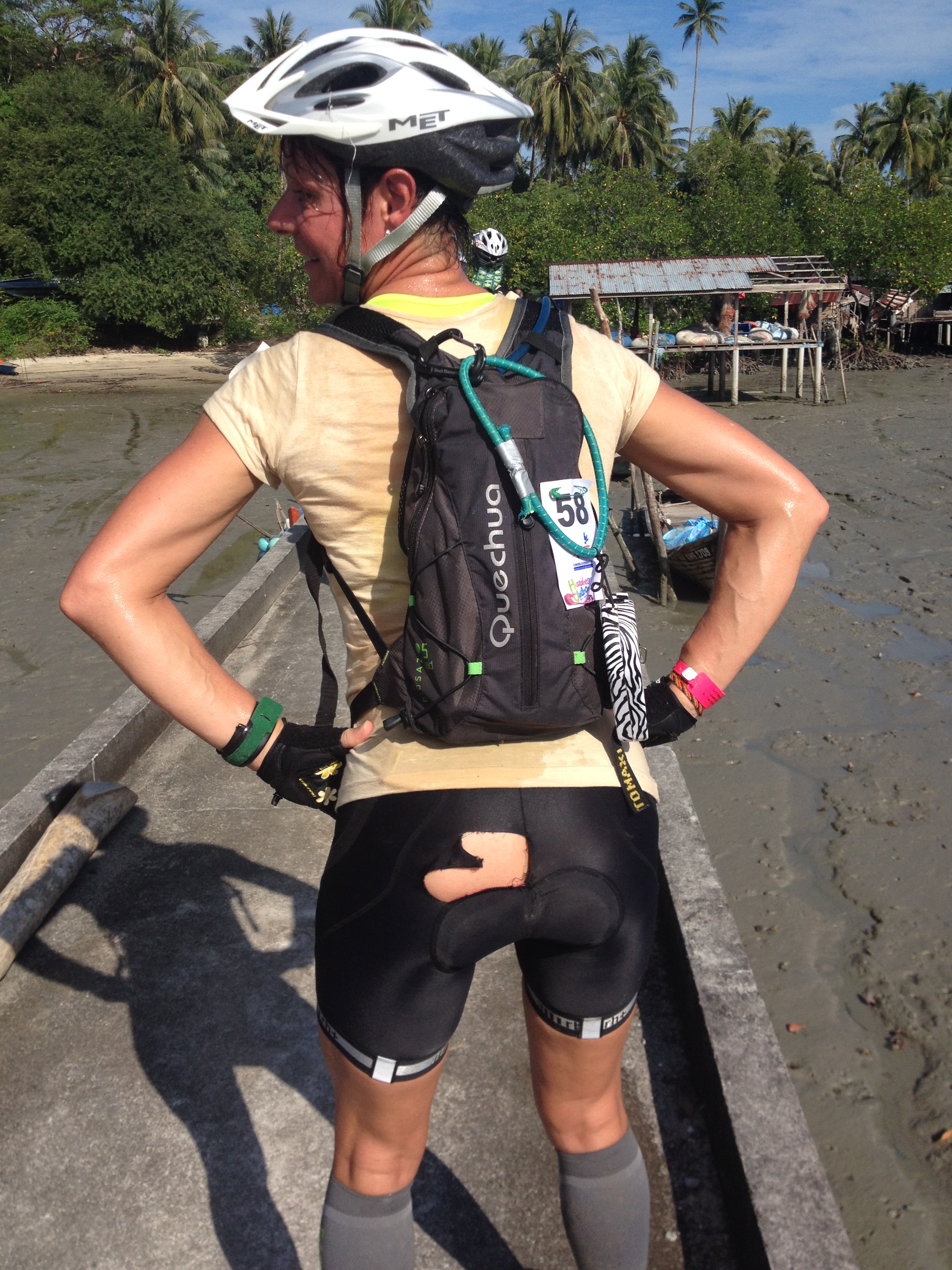 Pas simple de courir après 29km de vélo, Sylvie peine un peu à trouver son rythme, surtout qu'on est sur du béton, ce qu'elle déteste puis on attaque la jungle: tout petit single dans une végétation très très dense jusqu'à un « chapeau chinois »: côte très très pentue suivie d'une descente tout aussi pentue. Dans un paysage européen, ce genre de relief est déjà très éprouvant mais dans une jungle inextricable, avec des lianes qui nous accrochent les pieds, des bambous auquel on ne peut pas 's'agripper et des arbres inconnus recouverts de gros piquants qu'il vaut mieux éviter, ça devient extrême! Cécile a détesté, Sylvie a adoré et Annick a guidé Cécile. Mais que c'était beau !!!!