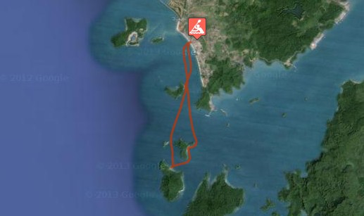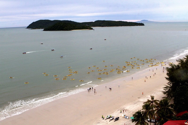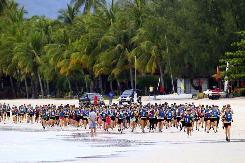 Vision assez impressionnante: 88 canoës posés sur la plage. On marche 1km jusqu'au drapeau du départ, ce sera donc course pour aller prendre un canoë et le mettre à l'eau.
