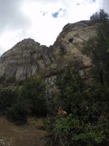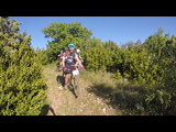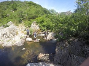 AT8: Départ pour un trek en remontée de rivière. Le roadbook nous dit de suivre la rubalise jusqu’à une traversé de rivière. Nous perdons sa trace et n’osons passer par le camping (le chemin était pourtant là) pour emprunter un pont et nous choisissons de longer la rivière pour la traverser en amont. Éric y tombe de tout son long, ce qui fait bien rire ses compères et nous reprenons notre avancée bien difficile le long de la berge pour enfin y trouver la balise mais que de temps perdu. S’ensuit la remontée dans le lit de la rivière jusqu’à une intersection avec un canyon sec que nous remontons parmi les buis et autres plantes à épines, ça gratte et ça pique !!!