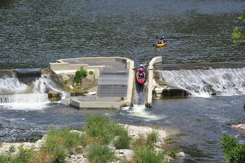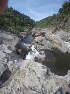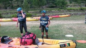 Nous profitons de la transition pour nous recharger en eau et en nourriture car nous partons pour 37 km de canoë et il parait qu’il n’y a pas beaucoup d’eau ! Cela va se vérifier après le passage de 3 rapides avec glissière dont une est fatale à Éric et Annick : hop à la baille ! Heureusement il fait chaud et nous sommes vite repartis. C’est après que notre chemin de croix commence ! Il faut descendre du bateau tous les 50m pour le pousser. La fin de ce parcours que nous terminons à la tombée de la nuit devient vite pénible. C’est dommage, le parcours était plutôt agréable dans les gorges de l’Eyrieux. Nous arrivons enfin à l’AT3 mais il faut encore trainer le canoë sur 100m. C’est lors de cette transition qu’Annick en profitera pour rencontrer l’âme sœur qui fera chavirer son cœur dans l’eau !