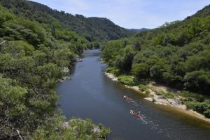 Section courte de canoë (13 km) que l’on commence au petit matin après avoir mis du temps à émerger, le réveil a sonné pendant 20 minutes avant qu’Éric ne l’entende. Nous partons au plus vite dans un enchaînement de petits rapides. C’est très agréable mais le canoë d’Annick et Éric semble lourd, il racle plus qu’il ne faudrait et cela devient difficile de le relancer et de le contrôler. On décide de s’arrêter pour le vider, il devait y avoir 30 litres d’eau et à peine reparti ça se remplit de nouveau. Heureusement la fin est là et nous rejoignons passablement énervés, Judicaël et Guillaume déjà secs. A cet endroit nous retrouvons le boy-friend d’Annick ainsi que d’adorables bénévoles qui nous offrent le thé.
