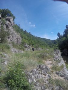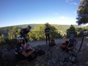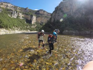 Arrivés à CP15, nous rechargeons en eau et c’est reparti en trek pour atteindre le haut des falaises des gorges de l’Ardèche. Deux rappels de 50 et 70 m plus bas nous voici à traverser l’Ardèche à pied.