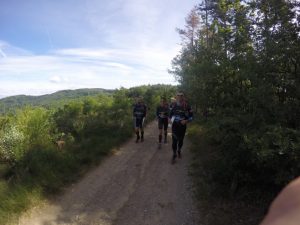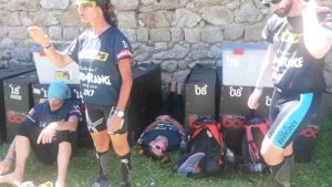 C’est reparti, Guillaume ressent à nouveau ses ampoules. Nous décidons de prendre les pistes plutôt que de couper mais erreur et nous voilà à traverser les genêts. On enchaîne, hésitation pour atteindre CP20 où on nous offre une bière. Faut y aller mais la route est longue et après avoir bien géré, la fatigue faisant son office, nous tergiversons et nous nous égarons quelque peu avant de retrouver notre route. C’est râpé pour la porte horaire, la fatigue est bien là et Annick voyant Éric tractant Guillaume marcher en dormant (tout comme Guillaume), nous décidons de prendre 1/2h de sommeil en bord de chemin qui se transforme en 1h devant