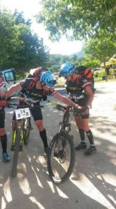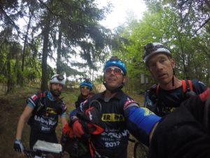 On récupère nos caisses VTT, le temps de s’équiper et nous voilà en fin d’après-midi sur une section VTT qui commence par une belle bosse: ça pousse et malheureusement ça repousse suite à une énième erreur d’orientation. On se recale et Judicaël et Guillaume mènent la barque comme il faut jusqu’à atteindre une piste que l’on espérait roulante ! Et bien non, c’est gavé de caillasses, c’est long et le sommeil pointe. Un CP salvateur puisqu’on y trouve des bonbons et surtout du savon… Vous comprendrez bientôt son importance.