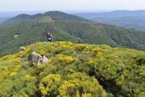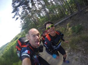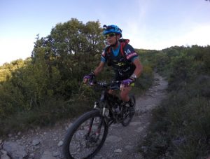Nous enfourchons nos fiers destriers et nous voilà partis pour 70 km de VTT et 2300 m de dénivelé positif entrecoupé par un court trek montagne. C’est bien simple, nous devons atteindre un col donc le début n’est que montée, montée et montée. Éric tracte Annick dès que possible et 3h plus tard, au coucher du soleil nous atteignons enfin le col. Nous y croisons un couple de retraités à l’apéro étonnés de nous voir et incrédules quand on leur dit pourquoi nous sommes là. Nous n’avons plus qu’à longer les crêtes pour atteindre le CP suivant. Les paysages sont somptueux mais le vent frais et les chemins absents rendent notre progression plus lente que prévu.