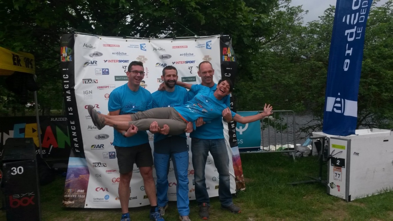 AT11: 20 km de VTT, 600 m de D+ mais régulier et sur une belle piste. Il est midi, on nous annonce 4h de route, la fin du Raid étant fixée à 16h on décide de tartiner un peu. Nous voilà partis sur un contre la montre par équipe, Annick tractée par Éric, Judicaël ouvrant la route. Nous atteignons le lac de Devesset en 2h30! On nous aurait menti ? Tant mieux. Reste à traverser le lac en catamaran mais devant le manque de vent nous sommes bon pour pagayer. Nous sommes accueillis par 400 Team et nous pouvons enfin fièrement franchir la ligne d’arrivée sous une douche de mousseux !