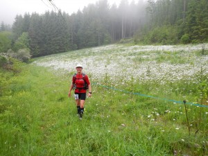 La 1ère balise est loin puisqu’on part sur toute la partie Nord de la carte, on a le temps de découvrir ce que va être toute la course, une succession de valons plus ou moins importants parmi des forêts de sapins…ce qui signifie que bien entendu, on ne court pas dans les côtes mais également quasiment pas dans les descentes ni sur le plat dès qu’on est hors chemins car beaucoup trop de branches au sol!